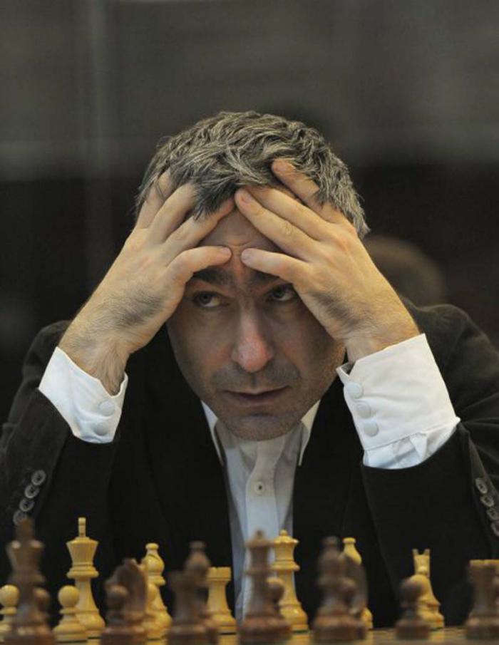 Vassily Mykhaylovych Ivanchuk se exprime el rostro, con las manos se arruga la frente y no deja en paz la ceja izquierda. Pensando. Se levanta, pasea por el salón, observa las demás partidas, habla solo y retorna a su silla. Repite el ritual cuantas veces sea necesario en las dos o tres horas de cada partida.