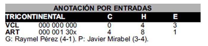 Excelente el trabajo del abridor artemiseño Raymel Pérez con siete entradas lanzadas permitiendo solo tres jits, todos sencillos, propinando cinco ponches y regalando un par de transferencias. Su relevo, Michael Ortiz, completó la lechada colgando los dos últimos escones. Andy Cosme, de 4-3 y tres carreras remolcadas, fue el mejor bateador del choque, secundado por el jardinero derecho y segundo en la tanda Lázaro Pérez, de 3-2 y una anotada.