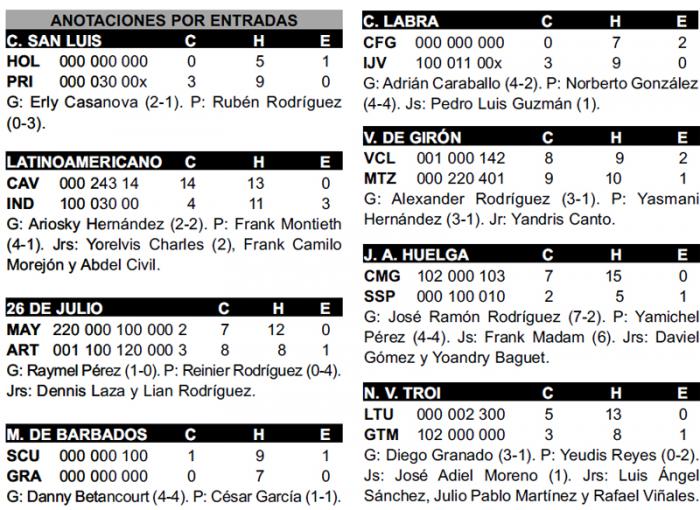 Importante la victoria de los Toros agramontinos que mantiene vivas sus aspiraciones de clasificación con un noveno lugar, a solo medio juego de Las Tunas y uno de Industriales. Buena labor del abridor José Ramón Rodríguez permitiendo una limpia en siete entradas, con Leonel Segura bateando de 5-3 y el designado y tercer bate Héctor Hernández de 5-2, dos impulsadas, además de Humberto bravo, de 2-2, un triple y dos anotadas.