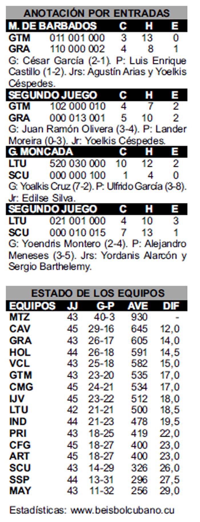 Y por poco los tuneros se llevan el gato al agua en el segundo. Ganaban 4-2 en el noveno cuando las Avispas marcaron cinco carreras, cuatro de ellas remolcadas por el oportuno emergente Sergio Barthelemy (un jonrón en 79 veces al bate y 30 juegos), quien le agarró un envío al mejor cerrador de los Leñadores, Yosbel Alarcón, y le sacó la pelota por el jardín derecho, el décimo bambinazo con bases llenas de la Serie y el primero de un santiaguero. Ahora Las Tunas presenta balance de 21 victorias y 21 derrotas, novenos detrás de la Isla (23-22), pero ya los Piratas terminaron su calendario y en la serie particular fueron barridos por los Leñadores.
