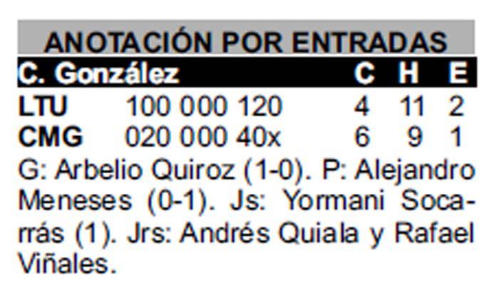 Este miércoles el choque dejó múltiples emociones desde el mismo inicio, con un gran duelo de lanzadores entre los derechos José Ramón Rodríguez y Alejandro Meneses. El primero regaló seis episodios de altura a los anfitriones, y entregó el pleito con ventaja a Arbelio Quiroz, quien permitió jonrón de Andrés Quiala (su único del campeonato) para igualar las acciones en el séptimo.