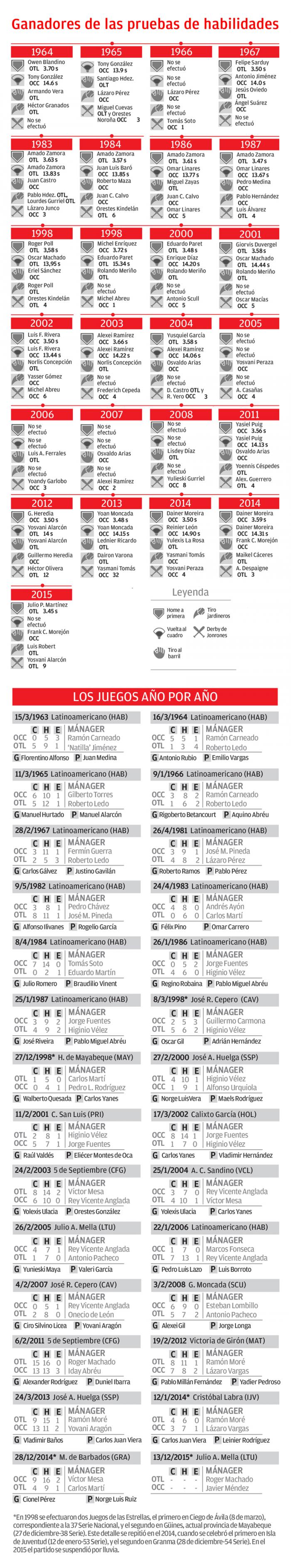 • Las pruebas de habilidades comenzaron en 1964, y además de las competencias habituales se hizo una carrera de 50 metros, ganada por el estelar velocista Enrique Figuerola. También participaron peloteros y venció Rigoberto Rosique con 6.0 segundos, igualado con Victoriano Moreno. La carrera se repitió en 1965 con triunfo de Orestes Noroña (5.9 s). Estas lides individuales solo no se efectuaron en los Juegos de 1981 y 1982.