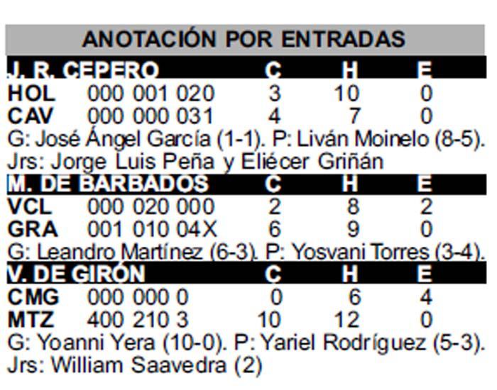 Su relevo fue el zurdo Liván Moinelo, otro de los escogidos para darle mayor amplitud al cuerpo de pitcheo. Pero luego de conseguir dos outs en el octavo y el primero del noveno, el tirador pinareño no pudo sacar ninguno más: Donal Duarte le conectó doblete a la pradera izquierda y, luego del pasaporte intencional a Yoelvis Fiss, Edilse Silva cuajó los ángulos con su sencillo al central y Osvaldo Vázquez dejó al campo a Holguín con cañonazo al izquierdo. El triunfo fue para el cerrador José Ángel García, quien contuvo una amenaza en el noveno obligando al zurdo Yusniel Ibáñez a batear para doble matanza.
