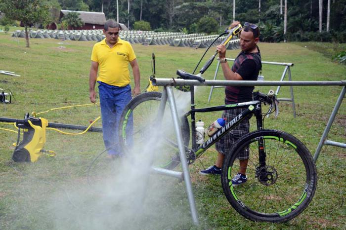 «Transitan por sitios intrincados y llegan repletos de barro. La limpieza de las bicicletas es crucial y utilizamos un sistema diseñado para fregar carros. Regulamos la presión de salida, de manera que podemos disparar donde se necesita. Por ejemplo, en los rodamientos y cajas de bola no se puede trabajar con presión y eso logramos controlarlo con este equipo. Además, es un equipo que optimiza el gasto, pues tiene una manguera fina que regula la salida del agua». (Yonier Rodríguez, comisionado de ciclismo en Pinar del Río que trabaja como personal de apoyo en la Titan Tropic)