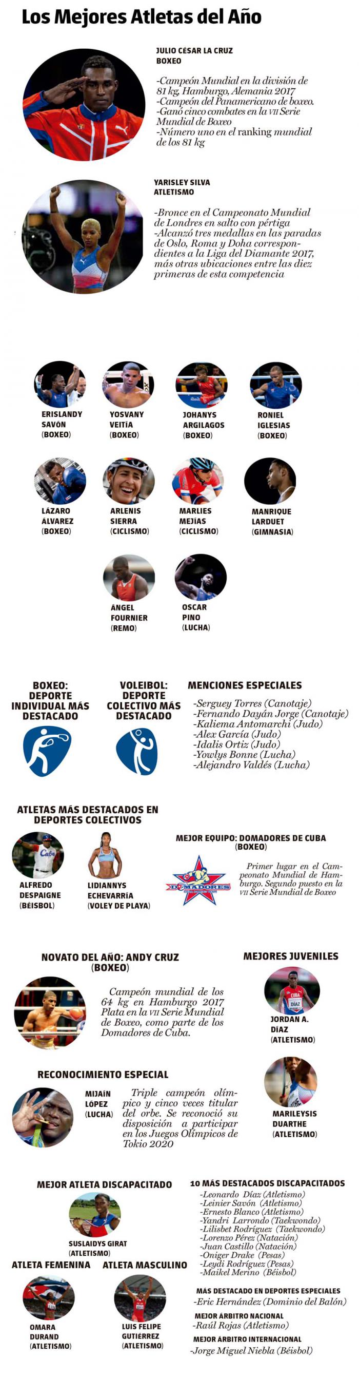 Los deportistas fueron seleccionados a partir de la encuesta realizada por el Inder, el Círculo de Cronistas Deportivos y la Unión de Jóvenes Comunistas. La Gala de Premiación de los atletas mayores será el próximo 23 de diciembre en el Salón de Protocolo del Laguito, en esta capital, mientras que los juveniles recibirán su galardón a inicios del 2018