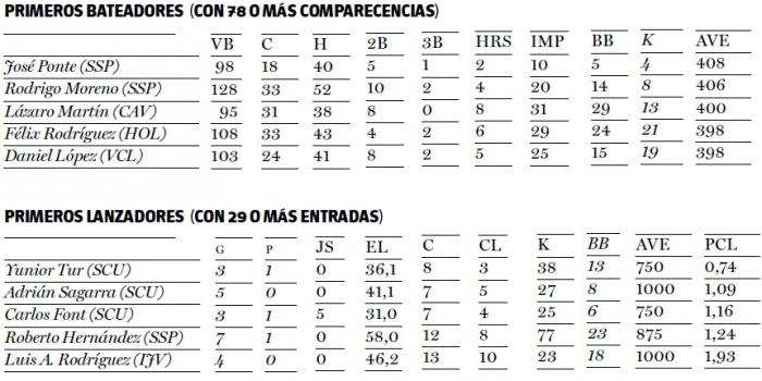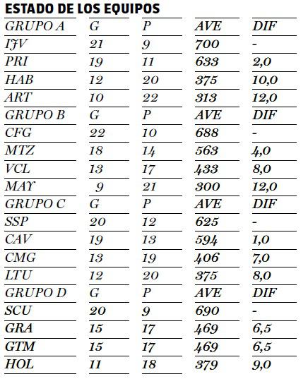 En los otros dos grupos las ventajas de los punteros parecen, a simple vista, casi decisivas. A pesar de haber jugado cuatro partidos menos, Santiago de Cuba enderezó el rumbo desde la salida y ya acumula 20 victorias y seis y medio juegos de diferencia con respecto a Granma y Guantánamo, apoyado fundamentalmente en su excelente pitcheo, 2,50 de pcl y 1,11 de whip, con tres de sus lanzadores como punteros en este importante departamento.