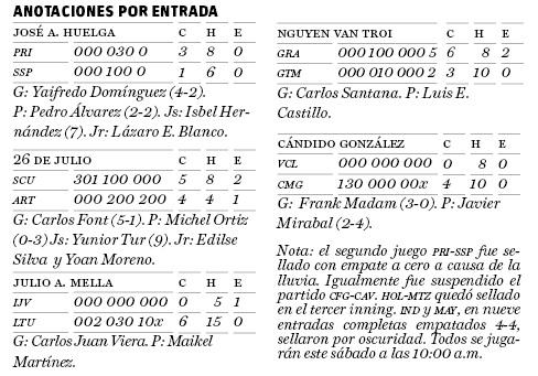 Tanto camagüeyanos como santiagueros ganaron sus respectivos compromisos y se mantuvieron en los dos primeros puestos de la 59 Serie Nacional, en una jornada caracterizada por la lluvia, con dos juegos sellados, uno suspendido y otro empatado a cuatro carreras.