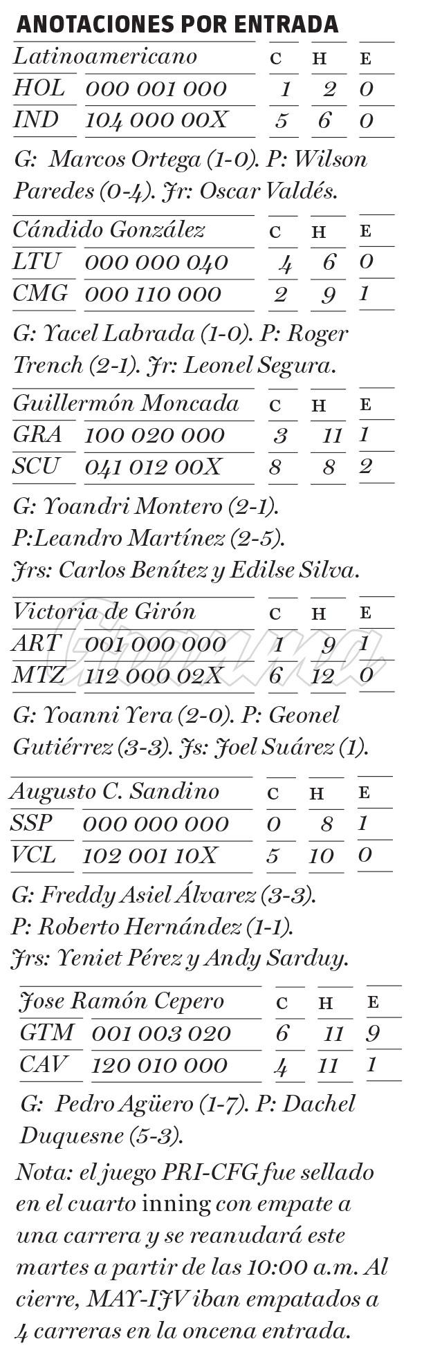 El área de picheo anda por el lugar 14, con 5,43 de promedio de carreras limpias (pcl); los relevistas exhibían 7,82 de pcl al concluir la subserie con Sancti Spíritus, en tanto hasta este lunes a sus lanzadores les bateaban para 314 de promedio, además de conceder 62 boletos.