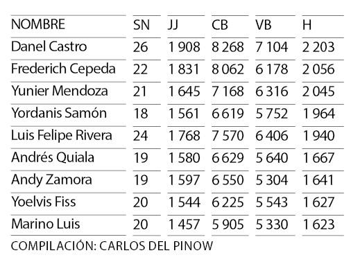 Esta lista la integran otros tres jugadores que no han anunciado su adiós del béisbol, y presumiblemente estarán en la 60 Serie Nacional: Frederich Cepeda, Danel Castro y Yunior Mendoza. Danel, ejemplo de amor a la camiseta mantenido durante 26 temporadas con los Leñadores tuneros, a sus 44 años es el de más jits entre los activos. Está a solo 12 de empatar en el histórico casillero con el yumurino Fernando Sánchez.
