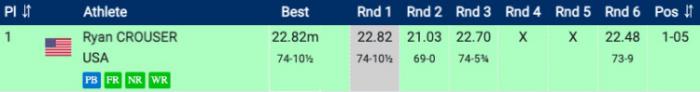 Crouser consiguió el registro en el primer disparo y, según el sitio web de la World Athletics, hubo un momento de desconcierto para los jueces, pues el implemento aterrizó más allá de los límites dispuestos para la competición en la alfombra del Randal Tyson Indoor Center.