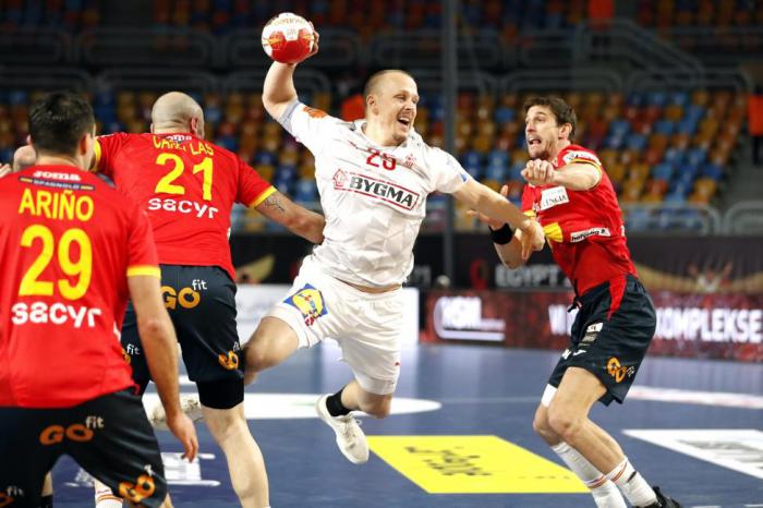 Por otra parte, Dinamarca se impuso (35-33) a una combativa España. En el primer tiempo, los daneses establecieron la ventaja definitiva al ganar por 18-16; sin embargo, los ibéricos cerraron el juego con gran efectividad al perforar la red en seis intentos en los últimos siete minutos, pero no fue suficiente. Mikkel Hansen repitió como máximo goleador con 12.