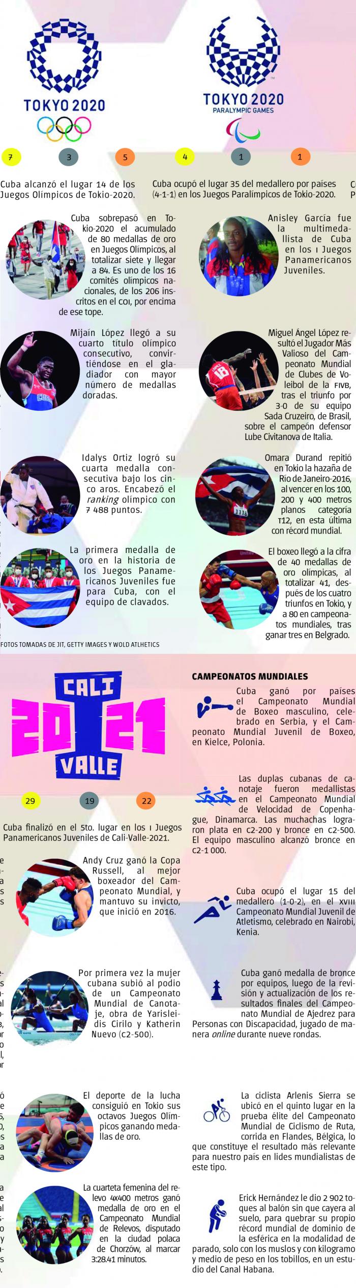 Aunque son muchas las glorias en un año retador como 2021, no solo las medallas expresan que se ha hecho un buen trabajo. Las marcas nacionales de Andrea Becali en el Mundial de Natación de curso corto, reflejan un renacimiento, pues son resultados que databan de hace 20 años; la propia clasificación de Daniela Fonseca y Jorge Moisés Campos, en el tenis de mesa, fue un éxito resonante que los llevó hasta la lid nipona; también emocionó Ludia Montero al levantar un sexto lugar en la halterofilia olímpica, lo mejor en esos conciertos de una mujer cubana, o el tercer puesto por equipos de los ajedrecistas en el Campeonato Mundial para Discapacitados.