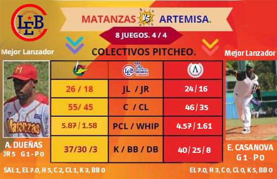 A eso hay que agregarle que la formación de los de la Atenas de Cuba no es, ni por mucho, la que enfrentó Artemisa en la etapa preliminar. En esa fase no alinearon Bárbaro Erisbel Arruebarruena, tampoco Rusney Castillo, Gracial solo jugó en los últimos cuatro, y Dariel Álvarez, a pesar de que ante Las Tunas no lució bien, con un jit en 16 turnos, no vio a los artemiseños. Yordan Manduley, uno de los peloteros más eficaces de Cuba, sin ser mediático, no estuvo con los matanceros, pero ahora es un puntal a la defensa y a la ofensiva.