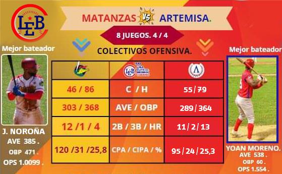 De cualquier forma, y a manera de compendio, aquí pueden ver lo que sucedió en esos enfrentamientos, con la profesional ayuda del estadístico Arnelio Álvarez de la Uz. Pero son tan distintos estos encuentros de postemporada, que el mejor bateador matancero frente a Artemisa, José Noroña, por demás, uno de los líderes jonroneros de la lid, no encontró un puesto de titular en su plantel.