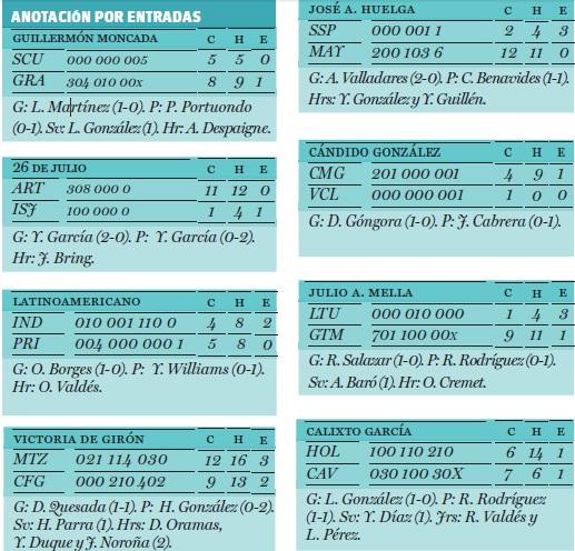 En Santiago de Cuba, Leandro Martínez condujo a Granma a su cuarta victoria. Lanzó siete completos, y solo Eduardo García, abriéndole el segundo episodio con jit, fue el único santiaguero que le entró en circulación, pues a partir de ahí retiró, consecutivamente, a 18 rivales, y a cuatro de ellos los ponchó. Su relevo, Alexei Alarcón, despachó a los tres que se enfrentó en el octavo, por lo que fueron 21 outs en línea; hasta que, en el noveno, cuatro imparables y una base, frente al relevista, les dieron a las Avispas sus cinco carreras, que no les alcanzaron.