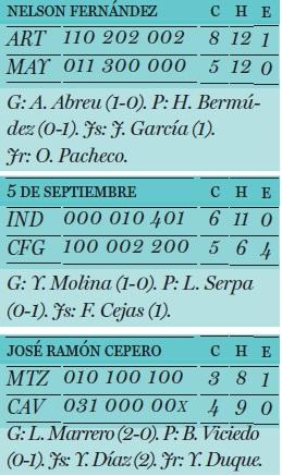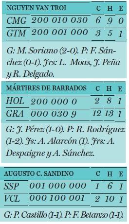 Otro que sigue sin perder, es Camagüey, conjunto que ha ganado sus últimos seis encuentros. Ayer doblegaron a los guantanameros, con excelente relevo de tres y dos tercios de Marlon Soriano. En tanto, Industriales, por segundo día, venció por la mínima a Cienfuegos. En ese cotejo, una base por bolas a Roque Tomás, con las bases llenas, definió el marcador final de un desafío en el que Yasiel Santoya tuvo tarde perfecta (4-4, incluyendo un doble), y anotó la decisiva.