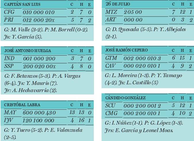 Leñadores y Alazanes, los escoltas de los Vegueros, no terminaron sus compromisos, al quedar sellados sus desafíos. Las Tunas iba ganando (5-2) en el cuarto a Holguín, y Granma perdía por 5-9 con Villa Clara, en el noveno capítulo.