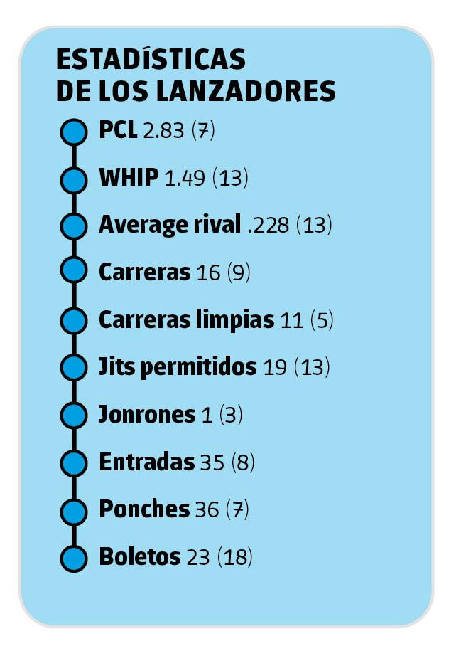 Sin embargo, su WHIP rozó los tres corredores en circulación cada dos capítulos, pues se ubican terceros en boletos concedidos, aunque lograron minimizar en gran medida los daños porque, por lo general, los monticulistas lograban meter el brazo.