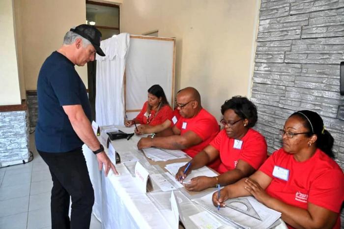 El Presidente @DiazCanelB llegó a las 8:20 a.m. y esperó su turno para ejercer su derecho el voto.