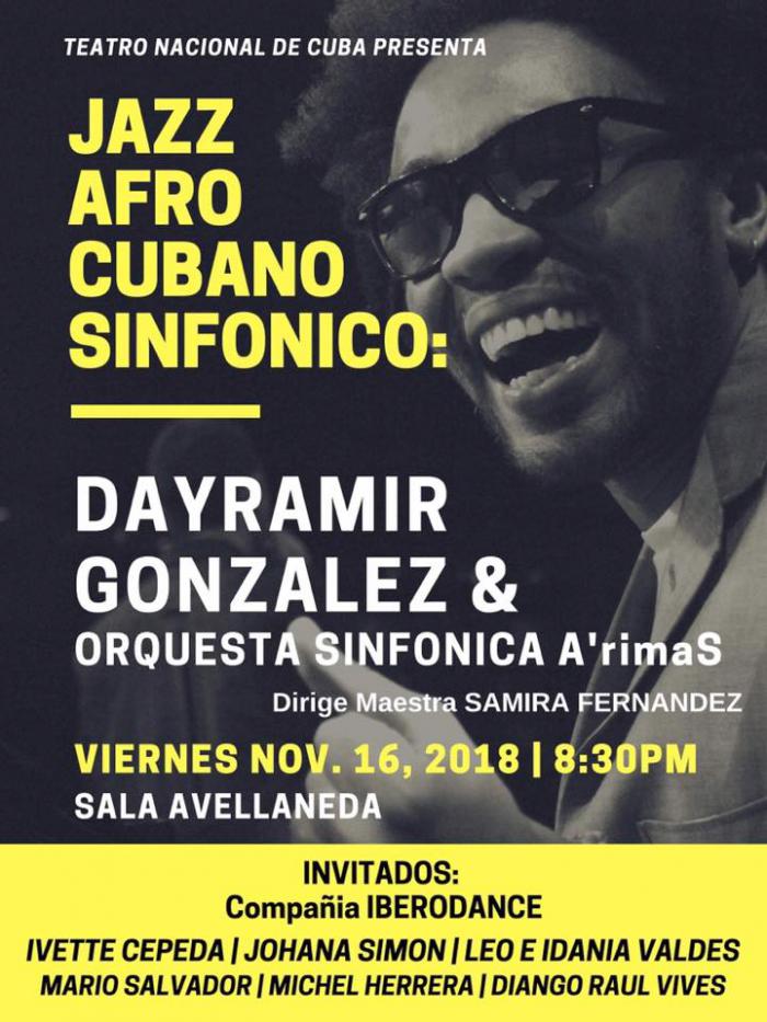 Viernes 16,8:30 p.m., Jazz Afrocubano Sinfónico. Dayramir González y Orquesta Sinfónica A´rimaS. Dirige maestra Samira Fernández .Invitados: Compañía Iberodance, Johana Simón, Leo e Idania Valdés, Mario Salvador, Michel Herrera, Diango Raúl Vives.