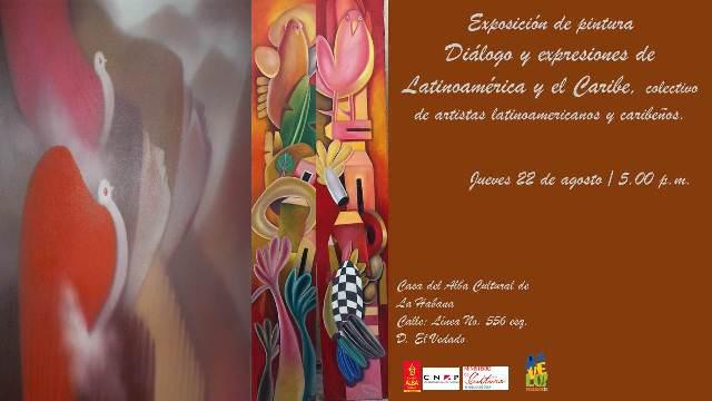 Jueves 22, 5:00 p.m. exposición colectiva de pintura: Diálogo y expresiones de Latinoamérica y el Caribe, colectivo de artistas latinoamericanos, de República Dominicana, México, Perú y Cuba. (los artistas cubanos son Arián García, Kamil Billaudy y Ruslán Torres).