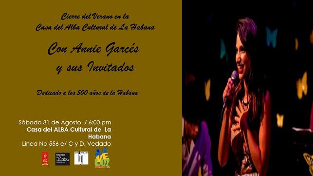 Sábado 31, 6.00 p.m.Cierre del verano en la Casa del Alba. Concierto con Annie Garcés y sus invitados. Dedicado a los 500 años de la Habana