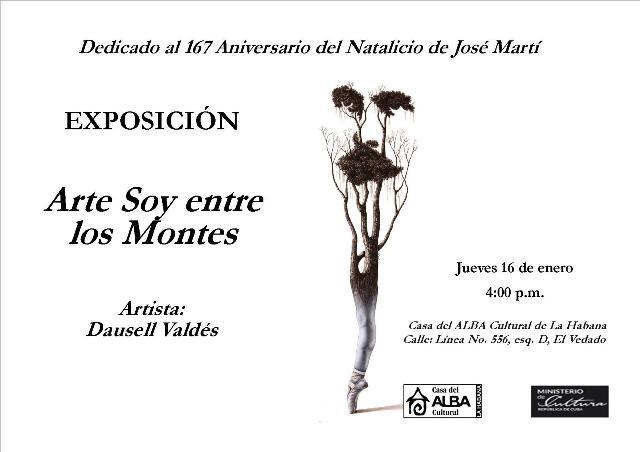 Jueves 16, 4:00 p.m. Inauguración de la Exposición Arte, Soy entre los Montes, del artista de la plástica Dausell Valdés. Dedicado a homenajear a José Martí en el 167 Aniversario de su natalicio.