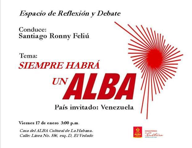 Viernes 17, 3:00 p.m. Espacio de reflexión y debate: Siempre Habrá un ALBA. Espacio de reflexión sobre la actualidad político-cultural de Latinoamérica y el Caribe con énfasis, en los países miembros del ALBA, y otros países que tienen una constante presencia en el accionar político, artístico y cultural. Conduce: Santiago Ronny Feliú, Miembro de la UNHIC de La Habana.