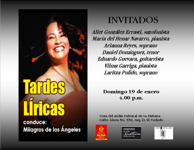Domingo 19, 4:00 p.m. Espacio Tardes Líricas. Dirige: Milagros de los Ángeles, soprano. Invitado: Aliet González, saxofonista.