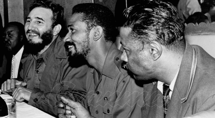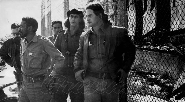 El comandante Juan Almeida Bosque durante la explosión del barco francés La Coubre, a su izquierda, Lino Carreras, destacado combatiente del Tercer Frente. Foto: Archivo de Granma
