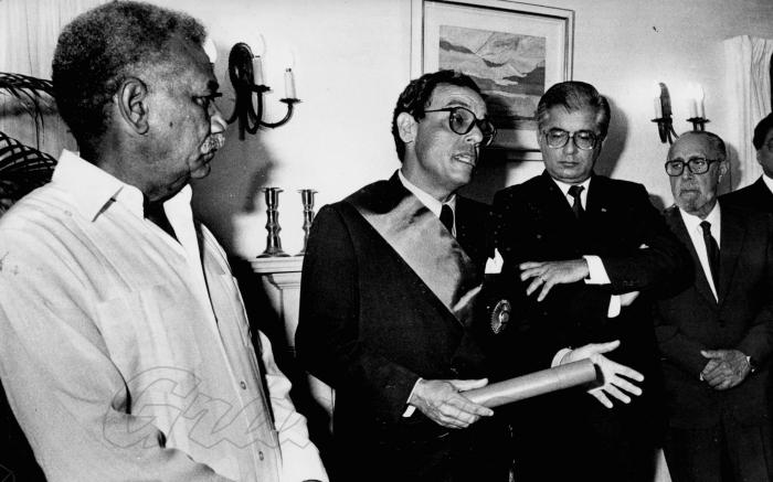 El gobierno de Perú condecora a Eusebio Leal, con la Orden al Mérito por Servicios Distinguidos en el Grado de Gran Cruz;con la presencia de Juan Almeida Bosque y Carlos Rafael Rodríguez. Foto: Pedro Beruvides