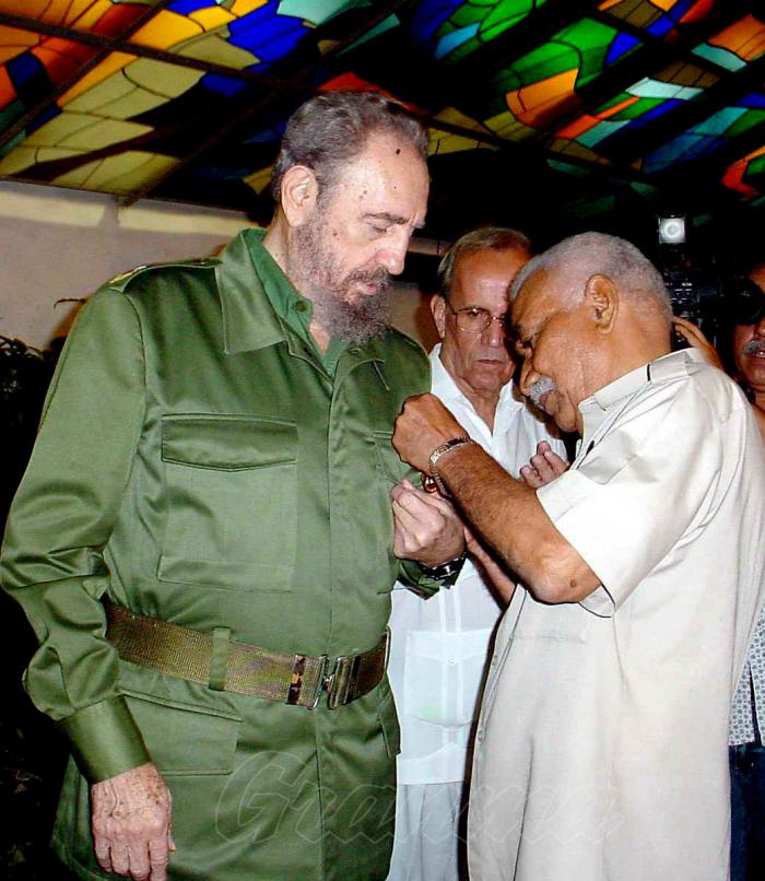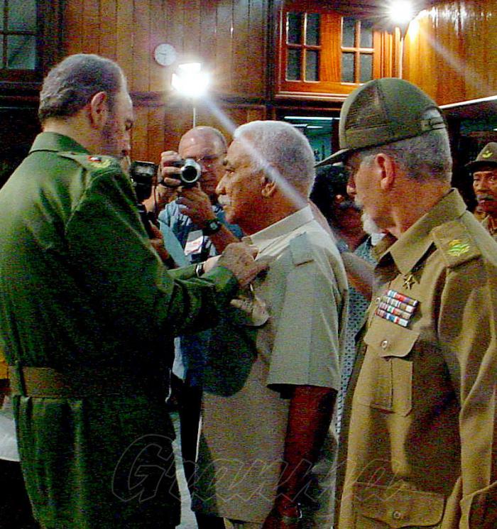 Almeida condecora al Comandante en Jefe Fidel Castro Ruz, en el Salón de los vitrales de la Plaza de la Revolución Antonio Maceo, en Santiago de Cuba, con la Medalla 50 aniversario del 26 de Julio, entregada por única vez,a los participantes de esa gesta y a los expedicionarios del Granma.Foto: Juvenal Balán