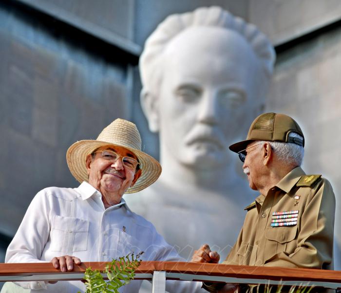 Raúl y Almeida en el desfile del Primero de Mayo de 2009 en la Plaza de la Revolución. Foto: Jorge Luis González