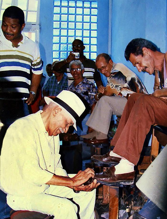 Juan Almeida Bosque de recorrido por Las Tunas, en julio de 2007, en el salón de limpiabotas en el bulevar, se empeñó en lustrar el calzado a uno que allí laboraba.Foto: Archivo de Granma
