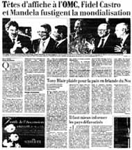 ¿Quién pudiera haberse imaginado hace un año solamente que Fidel Castro sería delirantemente aclamado en el templo mismo del liberalismo? Para las celebraciones del cincuentenario del sistema multilateral de comercio, el viejo rebelde cambió su uniforme por un traje oscuro, pero sus convicciones siguen siendo las mismas. Denunció el intento norteamericano de cometer "un genocidio económico" contra Cuba. Pero sobre todo, frente al poderío norteamericano, la emprendió contra el silencio de la OMC y contra el discurso predominante: "¿Por qué no se menciona el intercambio desigual? ¿Por qué no se aborda el tema de la carga insoportable de la deuda externa? ¿Por qué se ha reducido la ayuda al desarrollo?