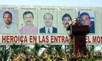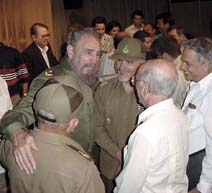 "Esa acusación la haremos polvo", aseveró Fidel. Y agregó que la inocencia de esos jóvenes con relación a esa imputación asociada al derribo de aquellos aviones, en un incidente provocado ciento por ciento por ellos, es total y podemos probarla. Con relación a ese tema, argumentó que ante las conspiraciones terroristas fraguadas en Miami el país debía defenderse con la inteligencia, con las ideas, con el espíritu de sacrificio de los jóvenes, en acto de legítima e irrenunciable defensa. Recordó que el gobierno de Estados Unidos, con la mafia como autora intelectual de la perfidia, fue añadiendo (en la medida que no podía probar nada) nuevas acusaciones en el proceso judicial de los cinco cubanos, hasta inventar lo de conspiración para asesinar. Luego de calificar la imputación de grosera y repugnante, puntualizó que el imperio tendrá que meditar mucho cada acusación porque el país cuenta con verdades irrebatibles. Al comentar el veredicto del jurado que calificó de muy grave los delitos de los cinco cubanos, el Comandante en Jefe señaló que existe aún un período de varias semanas en el que la jueza podrá tomar decisiones, aunque, dijo, no nos hagamos ilusiones porque las presiones sobre ella serán terribles. Cuba, aseguró, estará al tanto de cada cosa que digan, hagan y decidan. Tendrán que meditar cada una de ellas. Sabemos unas cuantas cosas que son irrebatibles. Cometerán decenas de errores. Y en cada uno irán perdiendo terreno... Insistió en que la batalla por el regreso podría tomarnos años, pero los cinco cubanos detenidos desde hace 33 meses en Estados Unidos bajo supuestos cargos de espionaje y otros delitos volverán a la Isla: "No saben el enredo en que se han metido (EE.UU.) al hacer estos planteamientos ridículos sobre cuestiones de seguridad y sobre supuestos delitos de nuestros compatriotas, que desde las entrañas del monstruo, y con riesgo diario de sus vidas, protegen a su pueblo". En una parte de su intervención, Fidel argumentó en detalles su afirmación inicial de que el país había pasado las últimas semanas luchando contra los demonios: tras comentar sobre las acusaciones hechas a Cuba por una supuesta agresión cibernética contra los Estados Unidos y la mentirosa campaña acerca de la compra de armas a China, expresó que esta tercera conjura es mas pérfida, pues actúa sobre los reflejos condicionados de millones de personas, al hablar de supuestas redes de espías que ponían en peligro la seguridad de Estados Unidos. Con evidente indignación, el Comandante en Jefe señaló que se referían a los patriotas apresados con desdén, con desprecio, como quienes cometían un gran crimen, cuando lo que se perseguía era penetrar las filas de los grupos terroristas miamenses, quienes gozan de la complicidad y la tolerancia de aquel gobierno. En ese sentido, recordó los hechos terroristas fundamentales de la guerra abierta llevada contra Cuba por la Casa Blanca, la ultraderecha estadounidense y la mafia cubano-americana, motivo más que suficiente para que nuestro país adopte legítimas e irrenunciables medidas que garanticen la paz y el desarrollo económico, político y espiritual de nuestro país. El momento histórico, explicó Fidel, nos obliga a recordar la batalla librada por el regreso a su Patria del niño secuestrado Elián González, la preocupación fundamental por la salud de ese pequeño, la vida física y mental de ese extraordinario niño. Ahora, precisó, no se trata de un niño de cinco años, sino de cinco hombres jóvenes, fuertes, heroicos, con muy profundas convicciones, cuyas mentes e ideas no pudieron cambiar, a los que no pudieron hacerles vacilar ni un segundo. Son un quinteto de gigantes, inteligentes y cultos, calificó el líder de la Revolución, para luego destacar, especialmente, el alto nivel profesional con que cuentan, hecho del que poco han hablado en el imperio porque sería reconocer la cultura y dignidad que la Revolución ha llevado al pueblo. Anunció que la opinión pública nacional y del mundo conocerá quiénes son esos cinco jóvenes, cómo piensan y actúan, y cuánto valor hay en ellos: "Y se convertirán en ejemplos no solo para los jóvenes y el pueblo de Cuba, sino también para la juventud y los pueblos del orbe". PRESOS POLITICOS, PRISIONEROS DEL IMPERIO "Sostenemos y estamos dispuestos a probar que son presos políticos, prisioneros del imperio", comentó Fidel para ratificar la inocencia de René, Fernando, Gerardo, Ramón y Antonio, cinco compatriotas que se han jugado la vida no solo para proteger a su pueblo, sino también para salvar a otras personas, incluso norteamericanas. Indicó que esos puntos de vista los puede sostener sólidamente, "porque esos compañeros no han cometido ningún delito". Recordó, en especial, cómo la información que hizo llegar la Isla a Washington, suministrada por patriotas desde la propia ciudad floridana durante los días previos al rescate del niño Elián González en Miami, contribuyó a evitar tragedias. Indicó que esta comunicación alertaba cómo los terroristas que aupaban el secuestro, planeaban disparar a las piernas de los policías estadounidenses y a las cámaras de televisión, para impedir que las autoridades norteamericanas sacaran al menor de la casa de la parentela. En otra oportunidad, reseñó Fidel, en junio de 1998, se produjo otro intercambio de información entre el FBI y nuestro Departamento de Seguridad del Estado, a propósito de una carta enviada por él a Bill Clinton, entonces presidente norteamericano, sobre los planes de grupos terroristas con base en territorio de los Estados Unidos, para derribar aviones en el aire. Clinton, reconoció el Comandante en Jefe, tomó aquello muy en serio, pero también publicó la carta, algo con lo cual nosotros no estábamos de acuerdo. Esos intercambios de información sirvieron para poner en sus manos un grupo de evidencias que les interesaba: cuatro carpetas con 320