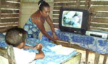 Prestamos atención, el Noticiero del mediodía, en vivo, presenta a pioneros de cuarto grado que reciben orgullosos, por primera vez, la Sortija Cuba, réplica de la que Doña Leonor, la madre de Martí, regalara a su hijo en Nueva York y que hiciera precisamente con los hierros del grillete que laceraron la piel del Apóstol durante el presidio político en Cuba. Los ojos del niño brillan y buscan en los de mamá una respuesta: "Cuando llegues a cuarto grado lo tendrás. Yoerlis cursa ahora el preescolar, pero está muy avanzado y lo demuestra escribiendo en su libreta Mamá, papá y todas las vocales con bastante buena caligrafía. Ana María, oriunda de Maisí, un día de fiestas visitó a los familiares en la zona, sin pensar que el destino le marcaba ya el futuro. Conoció a Antonio Silot Laffita, campesino del lugar y se unieron en la vida, lo que no impidió que entre 1981 y 1984 se graduara como maestra primaria en el Instituto Pedagógico Raúl Gómez García, de Guantánamo. Ambas decisiones hoy le valen de mucho: un hijo, un alumno y un salario mensual de 265 pesos. "Realmente nunca imaginé esto, aunque el anuncio, el proyecto, lo creí. La Revolución no miente y mucho menos Fidel. El televisor es importantísimo, veo las clases de Universidad para Todos, me preparo cada día mejor, estoy informada... le doy las gracias al Comandante en Jefe por llevar el programa a todo el país. No pensé que con un solo niño, que por demás es mi hijo, nos dieran tal privilegio", declaró emocionada. Cae la tarde y los tábanos (moscas que pican como mosquitos) se revuelven. Iniciamos el regreso tan sorprendidos e impresionados como Yoerlis y su mamá-maestra: la televisión, el video y muy pronto la computación llegaron a La Mesa de Jagüey, un paraje poco conocido de nuestra rica geografía. Periódico Venceremos. http://www.venceremos.cubaweb.cu/ |