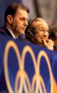Rogge a la derecha de Samaranch. El español Juan Antonio Samaranch, que cumple hoy 81 años, se marcha contento porque además de ver coronados estos dos deseos anteriores en el momento final de su carrera, su hijo de 42 años, vinculado a la federación internacional de pentatlón moderno, fue votado como nuevo miembro del COI este lunes.
