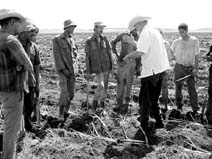 Ramón Castro explica a los trabajadores de la granja forrajera algunos secretos sobre la siembra del