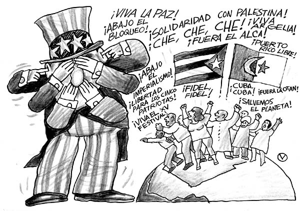 Hubo que trabajar mucho para rescatar los festivales y propiciar que uno de ellos se efectuara en Africa, apuntó el moderador Rogelio Polanco, director del periódico Juventud Rebelde, al iniciar el intercambio. Juan Carlos Marsán, miembro del Buró Nacional de la UJC, relató algunos momentos de la organización, la primera posibilidad de celebrarlo en Namibia y finalmente la sede definitiva de Argelia, un país con una tradición de lucha muy conocida. Cuba apoyó este evento en su propósito de darles continuidad a estos encuentros; aquí en La Habana se realizó la reunión preparatoria en la que participaron más de un centenar de organizaciones y de la cual salió el lema: Globalicemos la lucha por la paz, la solidaridad, el desarrollo, contra el imperialismo. Hemos tenido que enfrentar algunos ataques de la prensa occidental, porque estos encuentros son la tribuna de la juventud progresista y por supuesto no son del agrado de los reaccionarios. Pero el Festival ya es un hecho; más de 10 000 jóvenes de 107 países participaron en la cita. Y algo significativo fue la asistencia de 35 naciones de Africa y 19 de América Latina. El principal mensaje que pretendíamos era dar solidaridad al continente africano, y lo conseguimos.