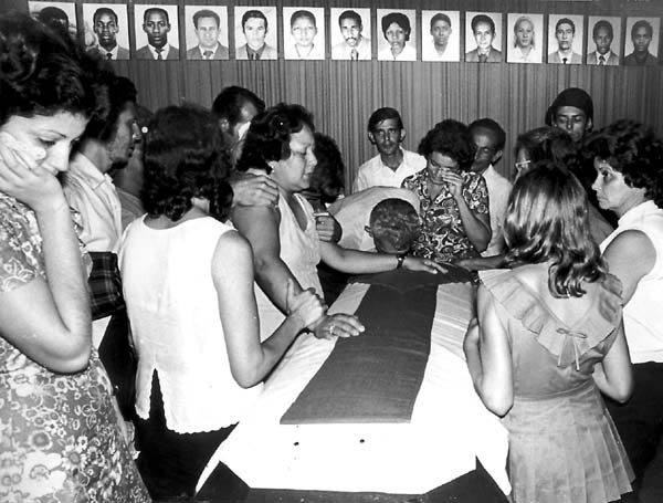 "Cuba pidió al Consejo de Seguridad que actuara acerca de la voladura en pleno vuelo del avión de pasajeros CU-455, en el que en 1976 murieron 73 personas, pero el proyecto de Resolución S/23990, propuesto por Cuba, ni siquiera fue considerado". En la foto, el pueblo llora a sus víctimas. |