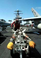 "Solamente este barco ha lanzado 136 000 kgs de bombas hasta el momento en Afganistán. Esa es una cantidad increíble", dijo el almirante Tom Zelibor al dirigirse a la tripulación del Carl Vinson por el sistema de comunicaciones. El Carl Vinson es uno de los cuatro portaaviones cerca de Afganistán. Según la apreciación del almirante Zelibor "los miembros del equipo aéreo están haciendo un trabajo excelente. Han sido muy precisos y están haciendo una gran labor en la preparación del campo de batalla para operaciones de cualquier naturaleza que puedan tener en el futuro", expresó Zalibor. La mayoría de las bombas que transportan los F-18 Hornet y los F-14 Tomcats son bombas guiadas por rayos láser y satélite que pesan entre 500 y 2 000 libras. Zelibor instó a la tripulación a no confiarse luego de casi 10 días de constantes bombardeos que parten del portaaviones, incluyendo aviones de ataque y de apoyo. "Mi temor mayor es que