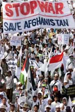 Manifestaciones antibélicas en Indonesia. La fuente precisó que el centro comercial recibió el impacto directo de varios cohetes lanzados por las naves norteamericanas. También fueron atacadas Kabul, y áreas aledañas a la ciudad de Jalalabad. Las bombas estadounidenses cayeron en las cercanías del hotel Intercontinental de la capital afgana y en una base militar del Talibán al sur de Jalalabad. El portavoz del Talibán, Abdul Hai Mutmaen, señaló que entre 600 y 900 personas han muerto o desaparecido en los ataques que comenzaron el 7 de octubre. Al tiempo que las autoridades del Talibán decían que el número de muertos por los ataques aumentó drásticamente, el representante de Kabul en Paquistán, el mullah Abdul Salam Zaeef, afirmó que la posición de su gobierno sobre Osama bin Laden no ha cambiado. Sobre los ataques aéreos, dijo que "los blancos han sido, en su mayoría, civiles inocentes". Zaeef señaló que "es incorrecto decir que nuestras capacidades militares han sido destruidas. Hemos tenido algunas bajas, pero seguimos fuertes". Interrogado sobre los presuntos atentados con Antrax en Estados Unidos, dijo que el movimiento afgano no tenía nada que ver con ellos. RECONOCEN DESEMBARCO DE TROPAS ESPECIALES Un comandante de la opositora Alianza del Norte dijo a la prensa, vía telefónica, que miembros de las fuerzas estadounidenses habían llegado al norte de Afganistán y se estaban movilizando con el caudillo, general Abdul Rashid Dostum. El desembarco de pequeños grupos de fuerzas especiales norteamericanas en el país ha sido visto como un viraje en la guerra que Estados Unidos desarrolla contra Afganistán, según CNN. Durante una entrevista realizada por esa televisora a la Consejera de Seguridad Nacional, Condoleeza Rice, esta reconoció que un número limitado de efectivos de fuerzas elite operan en suelo afgano. En el sur de Afganistán iniciaron operaciones de apoyo para la Agencia Central de Inteligencia (CIA) y se dislocan en los alrededores de la ciudad de Kandahar, dijo este viernes un funcionario de Defensa citado por la cadena noticiosa. La coordinación de una ayuda estadounidense en gran escala hacia la oposición afgana y el estudio del terreno para un probable desembarco posterior de mayores unidades norteamericanas, podrían encontrarse —según analistas consultados por CNN— entre las misiones que ahora cumplen los efectivos estadounidenses. Fuentes del Pentágono dijeron que las fuerzas especiales están contactando a sectores de la población afgana opuestos al gobierno Talibán. Dijeron además que el contingente podría aumentar en las próximas semanas. PROTESTAS POR LA PRESENCIA YANKI Cientos de mujahidines (guerreros del Islam) participaron hoy en diferentes manifestaciones en las principales ciudades de Paquistán, con la convicción de que llegó la hora de pelear en Afganistán pues los estadounidenses pisaron tierra, indica Notimex. La noticia del ingreso de tropas especiales norteamericanas en el sur de Afganistán se había divulgado con amplitud en todo Paquistán a lo largo de este viernes, a través de la radio, la televisión, los diarios vespertinos, de boca en boca. Los guerreros del Islam habían sido informados la semana anterior de que el Talibán estaba regresando de Afganistán a los mujahidines que habían llegado para participar en la defensa de ese país. "Esperen que comience la guerra terrestre", les dijeron. Ahora es que los mujahidines están convencidos de que serán requeridos por los comandantes del Talibán. El tema principal de las manifestaciones islámicas de este viernes en todo Paquistán fue el apoyo que el gobierno local habría dado para la invasión de fuerzas especiales, y la organización de la Yihad. Según los clérigos paquistaníes, la Guerra Santa se preparará en todas las mezquitas y madrassas (escuelas islámicas) de ese país. En Islamabab, así como Karachi, Lahore, Rawalpindi, Quetta y Pashawar se registraron protestas este viernes. CONTINUA GUERRA PSICOLOGICA Después de golpear a la mayoría de las ciudades afganas por 13 días seguidos, EE.UU. comenzó a transmitir mensajes a los afganos instándolos a alejarse de las instalaciones militares del Talibán. Washington desplegó aviones lentos EC-130E de operaciones psicológicas del Comando Solitario que transmitieron mensajes en dialectos locales en los que se advertía que los afganos podrían ver tropas estadounidenses en el terreno. "No deseamos hacerles daño", dijo uno de los mensajes. "Traten de encontrar la forma de ignorar las peticiones de ayuda del Talibán y de Osama bin Laden y no les den alimentos o albergue". Las transmisiones prometieron una guerra sin cuartel contra los soldados del Talibán y los partidarios de la red de Bin Laden, Al Qaeda, que se nieguen a entregarse a las fuerzas estadounidenses. LA ONU Y LOS REFUGIADOS AFGANOS CRITICAN CAOS Los afganos que huyen de los ataques aéreos contra sus ciudades fluyen en grandes cantidades hacia la frontera con Paquistán y solo este viernes llegaron 3 500, según Naciones Unidas. Muchos describen la jornada cada vez más caótica. Ron Redmond, vocero del Alto Comisionado de Naciones Unidas para los Refugiados, ACNUR, dijo que el flujo de personas continúa. La situación ha sido descrita por los supervisores como caótica, dijo Redmond, en Ginebra. "La gente llega sin alimento ni pertenencias. Algunas familias se han separado''. Fuentes en la frontera dijeron a Reuters que las cifras del ACNUR probablemente se quedaban cortas porque muchos afganos estaban cruzando por sitios donde no existen puestos de control. Asegura EFE que Rusia y otras naciones ex soviéticas de Asia Central coordinaron hoy medidas urgentes para enviar socorro por medio de tres corredores de transporte a centenares de miles de refugiados amenazados por el hambre y la guerra. INSTAN A EE.UU. A "LIBERARSE DEL TERRORISMO SIONISTA" EFE desde El Cairo informa que el líder del Movimiento Constitucion
