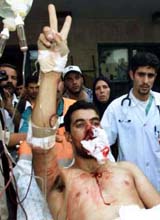 Herido por la metralla israelí, este palestino muestra su decisión de luchar hasta la victoria frente al ocupante sionista. Este martes, un niño palestino de 13 años, Nasser Koraan, murió a causa de las heridas que recibió el lunes por disparos israelíes en Kalkilia, una de las seis ciudades invadidas por tropas del estado sionista. Un cable de EFE informó que otros dos palestinos murieron hoy martes en los alrededores de la ciudad cisjordana autónoma de Tulkarem, durante enfrentamientos con soldados israelíes. Con estas muertes, el número de víctimas desde el inicio de la Intifada, el 28 de septiembre del pasado año, se eleva a 910, palestinos en su gran mayoría. El ejército de Israel había penetrado en Kalkilia en las primeras horas de la mañana de este martes con buldóceres escoltados por 20 tanques, para derribar una casa de familia de un presunto suicida. Según Reuters, el primer ministro, Ariel Sharon, rechazó el martes tanto las presiones de Washington como las de algunos partidos de su propia coalición gubernamental, que pidieron poner fin a la mayor ofensiva militar de Israel contra la Autoridad Nacional Palestina (ANP). Estados Unidos está ansioso porque Israel haga un alto a la violencia en momentos en que busca el apoyo árabe e islámico para sus acciones militares contra Afganistán. Sin embargo, las tensiones