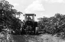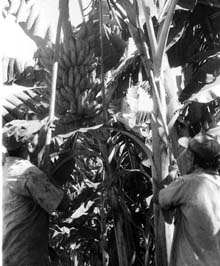 Juraguá tuvo momentos de esplendor, sobre todo en la producción de plátano. Gonzalo recuerda los favorables resultados productivos de la década de los años 80 y el récord establecido en 1992 cuando cosecharon 578 100 quintales. A las serias limitaciones del período especial se unió después la escasez de fuerza de trabajo, pues un número significativo de obreros, por voluntad propia, pasó a laborar en la construcción de la Central Electronuclear. Ante esa situación fue preciso mantener más de 700 movilizados permanentes, que posteriormente fueron sustituidos por fuerzas del EJT. La salinidad del agua del manto freático, por una excesiva explotación y la cercanía del mar, limitó el riego y por tanto, hizo descender la producción. SIN PERDER NI UN MINUTO Lucio Mota Espinosa llegó a "su" platanal poco después del almuerzo. "No se puede perder ni un minuto", dijo mientras empuñaba una vara larga y fina con un metal afilado en la punta para cortar las hojas secas o dañadas de las matas. El trabaja en Juraguá desde 1971, cuando terminó el Servicio Militar Activo. "Yo veo que esto está mejor que otros años. Eso no quiere decir que estemos al máximo, pero se ve un despegue en casi todos los cultivos", aseguró.