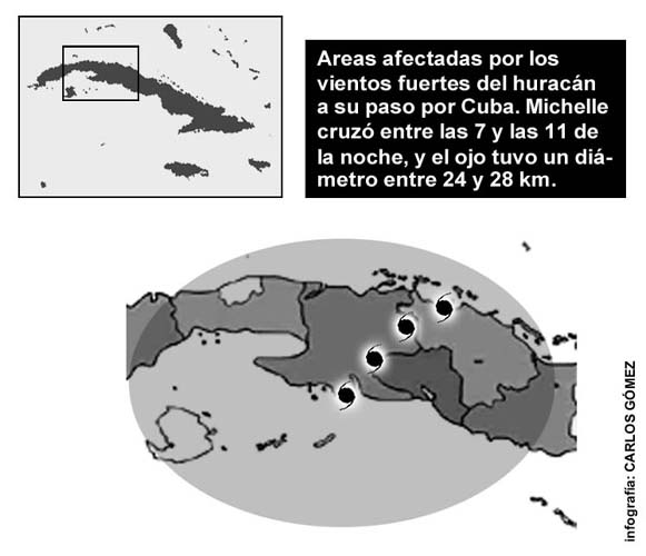 Michelle tuvo la peculiaridad de formarse en la etapa inicial de depresión tropical sobre la costa atlántica de Nicaragua, algo poco frecuente, pues la mayoría de estos sistemas meteorológicos se forman casi siempre en el mar. Permaneció estacionaria en tierra centroamericana durante 36 horas y el hecho de mantener buena parte de la circulación de sus vientos en el mar, le permitió sobrevivir bajo esas condiciones y salir al Golfo de Honduras, donde definitivamente comenzó a intensificarse de manera gradual hasta convertirse en tormenta tropical el día 31 de octubre y en huracán, durante la mañana del viernes 2 de noviembre. Junto con su lento movimiento y constantes períodos donde apenas se movía o lo hacía en extremo despacio (al paso de un hombre, como dijo un anciano de Batabanó), Michelle se caracterizó también por tener una circulación muy amplia y el área de vientos con fuerza de tormenta tropical (entre 63 y 117 kilómetros por hora ) se extendía en un radio de unos 270 kilómetros a ambos lados del centro de su trayectoria. Ello explica el porqué se sintieron vientos tan fuertes en la zona este de Pinar del Río, las dos provincias habaneras y Sancti Spíritus, que estaban bastante alejadas del ojo o zona central del ciclón. Incluso, estos llegaron en rachas a ser huracanados (118 o más kilómetros por hora), porque generalmente estas suelen ser hasta 1,5 veces superior a la velocidad del viento máximo sostenido. Así, un huracán categoría 2 como el Lily que nos azotó en octubre de 1996, tuvo vientos en rachas de 192 kilómetros por hora. Tampoco puede olvidarse que en la circulación de ciclón tropical pueden haber tornados y tormentas locales severas, donde los vientos son más fuertes a los que trae el fenómeno. En Cuba hay ejemplos de huracanes con un radio de influencia incluso mayor al de Michelle. Basta citar el célebre que cruzó sobre La Habana entre el 10 y el 11 de octubre de 1846. Conocido con el nombre de Tormenta de San Francisco de Borjas, dicho organismo alcanzó Categoría 5, la máxima en la escala Saffir-Simpson que en la actualidad mide la intensidad de los meteoros, con vientos máximos sostenidos por encima de los 250 kilómetros por hora y una presión mínima central de 916 hectopascal, la más baja reportada en Cuba. Para asombro de todos los especialistas que han estudiado este fortísimo ciclón, los vientos huracanados se sintieron desde Pinar del Río hasta las inmediaciones de las hoy provincias orientales, es decir a más de 600 kilómetros del centro. Es oportuno aclarar que la zona de influencia de un huracán no responde necesariamente a su potencia. Tal es el caso del Andrew (azotó el sur de la Florida en agosto de 1992) y pese a tener vientos de hasta 240 kilómetros por hora, el campo de acción de estos y sus áreas de lluvias cubrió un área mucho menor a la de Michelle. Entonces, no hay que sorprenderse porque el anillo de vientos fuertes de Michelle influyera sobre siete provincias del país y el municipio especial Isla de la Juventud. |
