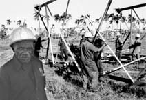 Desde la noche del lunes, Garrudo comanda a 80 hombres avileños y holguineros, integrantes de las primeras caravanas que entraron a Colón, cargados con las estructuras de las torres y los conductores necesarios para restablecer el servicio: "Ninguno de nosotros, confiesa el joven ingeniero, imaginó el espectáculo dantesco que encontraríamos al amanecer, pero en lugar de lamentos se multiplicó el compromiso de iniciar una batalla contra el tiempo". "Detrás de nosotros, explica Garrudo, llegaron grúas y buldozers de los contingentes que construyen en Varadero, y este viernes estará incorporada una brigada del MICONS. En los próximos días, al terminar en sus respectivas provincias, se nos sumarán nuestros colegas de La Habana, Villa Clara y Cienfuegos. Esa fuerza nos permitirá abrir tres frentes y cumplir el compromiso de entregar la línea en 20 días". —¿Y cuál es la mayor complejidad de la tarea? "El desmonte de las 32 estructuras averiadas, algunas en zonas todavía inundadas. Es un trabajo peligroso, que requiere de medidas extremas de seguridad. Los conductores se deben desprender con el mayor cuidado posible, evitando incrementar sus daños. Por lo demás no hay problemas, todos estos hombres son especialistas de una alta profesionalidad en el ensamblaje y la erección de las torres. Es como un comando habituado a este tipo de contingencias". —¿Qué recursos faltan hoy a pie de obra? "Contamos con lo necesario. Las torres averiadas fueron traídas de la antigua Unión Soviética; en su lugar instalaremos las que hoy se fabrican en Metatunas, que son de probada calidad. Ahora mismo acaba de entrar un grupo electrógeno (planta eléctrica) y esperamos la llegada de unos reflectores que nos permitirán alargar la jornada a horas de la noche. La alimentación es buena y el campamento lo instalamos en el politécnico de Banagüise, donde dormimos unas pocas horas". "Pero el recurso fundamental, el que no se va a agotar con facilidad, es el hombre. Ahí los tienes, puede que estén ojerosos y hasta preocupados por la familia, pero todos halan parejo, y siempre adelante. De esa estirpe son los eléctricos". LA OTRA GUERRILLA Juan Fis Valencia, el jefe de las tres cuadrillas holguineras, no tuvo tiempo de avisar a su familia: "Teléfonos no hay, y mucho menos tiempo para salir a buscarlo", afirma este recio hombre de 61 años, curtido por el duro trabajo de armar y parar torres, un oficio del que siempre aprende algo nuevo hace algo más de tres décadas, años en que regresó de una misión internacionalista en el Congo, bajo las ordenes del Che Guevara, y decidió integrar esta otra guerrilla. "Cada torre, describe Fis, pesa siete toneladas, mide 38 metros y se `siembran' entre 350 y 400 metros unas de otras, en dependencia de la situación del terreno. Montarla requiere de precisión y cuidado, no por gusto hay un técnico de seguridad junto a cada brigada. Trabajamos con hierros vivos, rodeados de equipos pesados, lo que aumenta la posibilidad de accidentes fatales". Como un arquitecto a pie de obra, Fis va guiando a sus jóvenes operarios. Es el primero en cargar las estructuras, aprieta tuercas y guía las operaciones del gruero. A los hombres así hay que respetarlos. Los muchachos sudan la gota gorda, aun en medio de la agradable temperatura de esta mañana de noviembre. Fis les recuerda que una parte importante del país está oscura, y mientras así sea ninguno tiene derecho a cansarse. Unos 400 metros más al oeste, en el mismo ajetreo, anda Manuel Castillo. Sus compañeros lo conocen por Achú, "el que más le sabe a las torres". Me cuentan que en cada matutino, antes de salir para la línea, todos lo escuchan en silencio; y dicen sus muchachos que al acercarse a Colón no pudo contener las lágrimas. Prefiero ni preguntarle los motivos. Basta con saber que entre hierros también habitan seres sensibles que se estremecen ante el dolor ajeno. Y Achú es uno de ellos. Antes del regreso a la capital, marcado por el entusiasmo de la guerrilla de Fis, vuelvo a detenerme frente a la primera torre que se termina en el campo de batalla de Banagüise. El viejo Fis nos mira como implorando que no le hagamos más preguntas. Y como quien se conduele de nuestra frustración, dice con sus palabras de viejo sabio: "Cuéntenle a Cuba entera que no saldremos de aquí hasta que no esté sembrada la última palma real de la electricidad". |