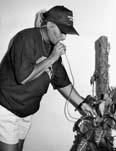 Mas en particular, el paso final de la ofensiva supervisa los tratamientos focal y adulticida para observar la probable existencia de focos residuales, comprobar mediante el intercambio con la población y otros métodos prácticos la efectividad de la fumigación, medir las normas técnicas en tal maniobra y la preparación del producto insecticida. A la par de estas funciones, los controladores de la calidad insisten también en dotar a las familias de la indispensable educación sanitaria. BÚSQUEDA Y CAPTURA DEL MOSQUITO Con un instrumento artesanal, pero efectivo, cuyo nombre pudiera ser cazamosquito o algún término similar, encontramos a Norma Terraza en plena faena por capturar uno de estos insectos adultos posado en una planta de malanga (sembrada correctamente en tierra).