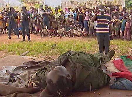 Según esta fuente, Savimbi fue alcanzado en la tarde de este viernes por 15 disparos, durante un combate entre sus efectivos y las Fuerzas Armadas Angolanas (FAA) en la región de Luvu, al sudeste de la ciudad de Luena, capital de Moxico. De acuerdo con la fuente, en el cuerpo de Savimbi fueron encontradas, atadas alrededor de la cintura, dos cintas de paño verde y roja, lo cual se estima era un amuleto para su seguridad. Medios militares contactados en el terreno por la ANGOP confirmaron también la muerte de dos generales de brigada, Big Jo y Bula, quienes integraban la seguridad del líder de la llamada organización del gallo negro. Algunos de sus más cercanos colaboradores consiguieron escapar y se encuentran dispersos por la selva, precisaron. |