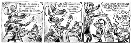 El terrorista Reich amenaza al continente Mario Jorge Muñoz Lozano La travesía de Otto Reich —elegido el pasado lunes para el cargo de Secretario de Estado Adjunto para América Latina del gobierno de Estados Unidos— por los tremebundos mares de la política hostil de Washington hacia Cuba y en la guerra sucia contra Nicaragua y otras naciones de la región, fue nuevamente abordada por la Mesa Redonda Informativa de este viernes, realizada en los estudios de la Televisión Cubana. Randy Alonso, moderador del foro, significó la amplia repercusión que han tenido en los medios de prensa extranjeros los análisis del jueves acerca de la designación de Reich en el ejecutivo norteamericano y su trayectoria anticubana y antilatinoamericana. Advirtió que fiel a la siniestra historia de su apellido, Reich, connotado cómplice de terrorismo, tráfico de drogas y genocidio, ha comenzado su paso por el Departamento de Estado en la actual administración haciendo recordar los aires de Guerra Fría que imperaron durante los más oscuros días del mandato de Ronald Reagan. Subrayó que a Latinoamérica le esperan tristes momentos en su difícil relación con el gigante del Norte, al tener que lidiar con tan pérfido personaje, acostumbrado a la imposición, la violencia, las artimañas y la mentira. Consideró que pocos antecedentes peores puede haber tenido tan alto cargo de la administración norteamericana. Alonso señaló que tras las delirantes declaraciones de Reich sobre Cuba, poco habría que añadir a lo sabiamente expresado en las opiniones de nuestro pueblo en contra de tal designación y en las que se reiteró la disposición segura de los cubanos de continuar defendiendo a su Revolución. En otra de las intervenciones, Reinaldo Taladrid, de la Televisión Cubana, llamó la atención sobre el hecho de que tan siniestro personaje, vinculado a tantas historias de manipulaciones y mentiras, sea en estos momentos la segunda figura en la política de EE.UU. hacia Latinoamérica. Citó varios casos en los que la figura de Reich estuvo vinculada con rumores y falsedades, algunas de ellas, sobre la supuesta adquisición de armamento químico y aviones Mig soviéticos, divulgadas por su oficina de entonces con el objetivo de precipitar la escalada militar contra la Nicaragua sandinista. Ese mismo hombre, advirtió, con un expediente tan diabólico, será el encargado de lidiar con la situación en Colombia, la crisis en Argentina, con el Área de Libre Comercio de las Américas (ALCA), con los diversos problemas de la región. Es evidente que Reich representa un nuevo peligro para América Latina, además de ser un peligro para la credibilidad de cualquier gobierno que se respete. A la vez que Estados Unidos lanza y promueve una llamada campaña antiterrorista, pone a un terrorista a dirigir la política hacia el continente. No resulta extraño entonces que tantos políticos y personalidades de la sociedad civil latinoamericana y de Estados Unidos se hayan pronunciado en contra de tal designación, coincidieron las colegas Juana Carrasco, de Juventud Rebelde, y Arleen Rodríguez, editora de la revista Tricontinental. Entrevistado acerca del funesto personaje, Max Lesnik, periodista cubano radicado en Miami, se refirió a los vínculos de aquel con el mundo tenebroso de las acciones terroristas directas contra Cuba y a su relación con el terrorista Orlando Bosh. Cuba se verá este año frente a un enemigo acérrimo, en función de los peores intereses de la mafia terrorista cubanoamericana y de la extrema derecha en el Congreso, concluyó. Vía telefónica, Domingo Rangel, periodista y escritor venezolano, indicó que la designación de Reich es el signo más reciente de la política reaccionaria y agresiva de la Casa Blanca. Eduardo Dimas, por su parte, dijo que el flamante subsecretario constituye un verdadero peligro para la estabilidad y la seguridad de la región, ya que representa el regreso de la política de guerra sucia que caracterizó en los años 80 al gobierno de Reagan. El colega de la Televisión Cubana enumeró un grupo de personalidades e instituciones serias que han protestado por la imposición de una figura con un pasado tan siniestro para tan importante cargo en los vínculos con el continente. Al respecto, el Centro de Estudios Estratégicos, con sede en Washington, sentenció que las relaciones de Estados Unidos con América Latina están en un momento clave, y Reich es el hombre equivocado, con los instintos equivocados, con los intereses equivocados, en el momento equivocado para enfrentar esa política. Luego de citar la dramática situación social y política que azota a la región —poblada de pobreza, recortes a los presupuestos estatales, herida de muerte por la deuda externa—, Dimas manifestó que la llegada de Reich da mucho que pensar en cuanto a posibles cambios de estrategia en la política de Washington hacia Latinoamérica, sobre todo cuando se ha puesto de moda la famosa "lucha contra el terrorismo". Recordó que hay una serie de figuras peligrosas en el actual gobierno que regresan a ocupar posiciones. Y esto es muy grave. ¿Qué podemos esperar? ¿Dictaduras militares, guerras?, se preguntó Dimas. Por su parte, Rogelio Polanco, director de Juventud Rebelde, sostuvo que pese a las amenazas lanzadas hacia Cuba por el siniestro personaje, Cuba seguirá firme, porque contra nuestro país Estados Unidos ha probado los más diversos métodos de agresión y todos han fracasado. |